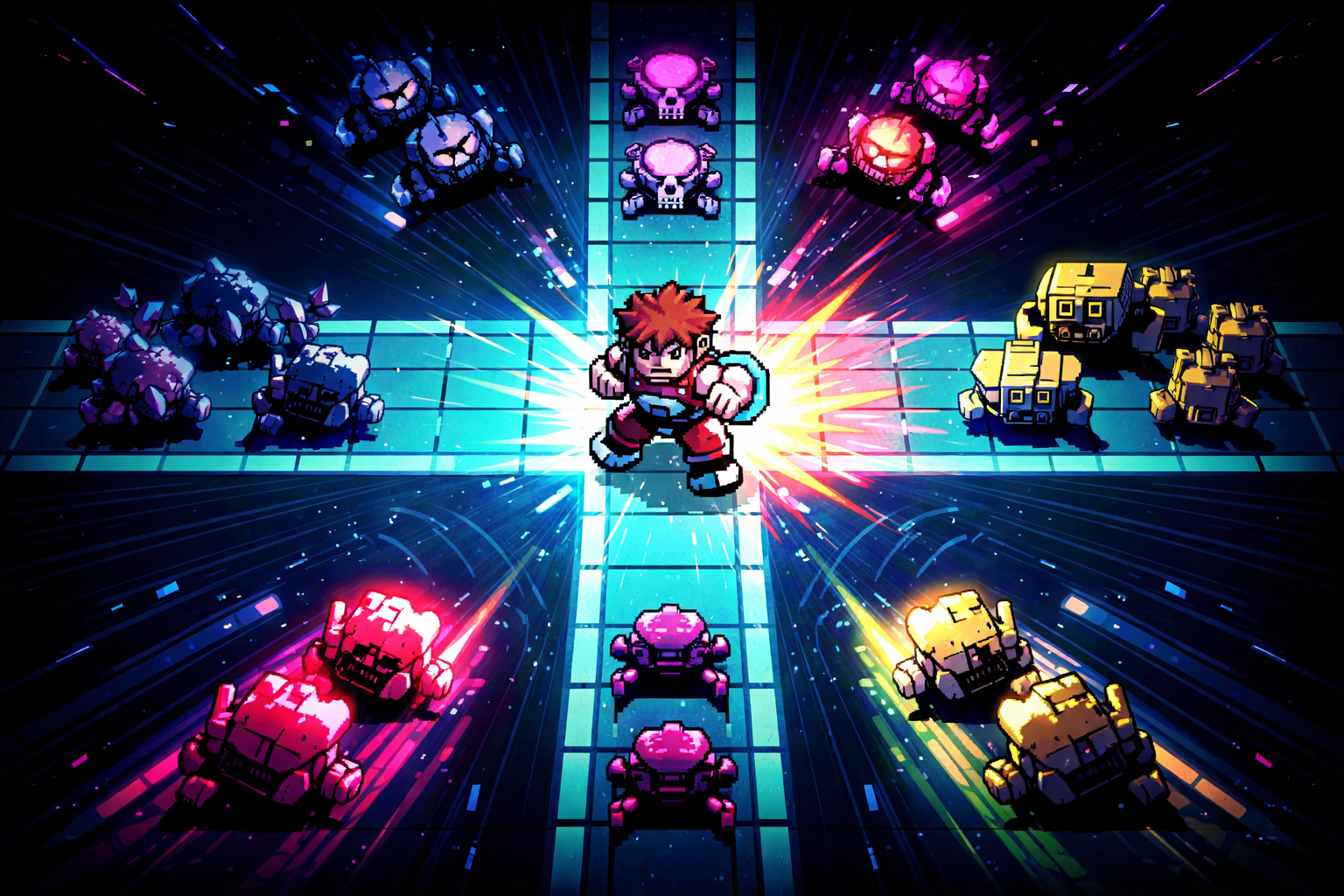Hold the center of a cross-shaped arena as enemies surge in from all four directions, stepping closer with every beat. Time each punch perfectly to smash threats at the last second in this fast, rhythmic test of focus and survival.